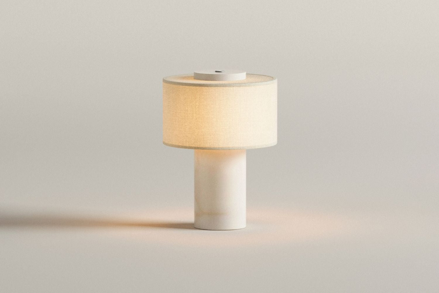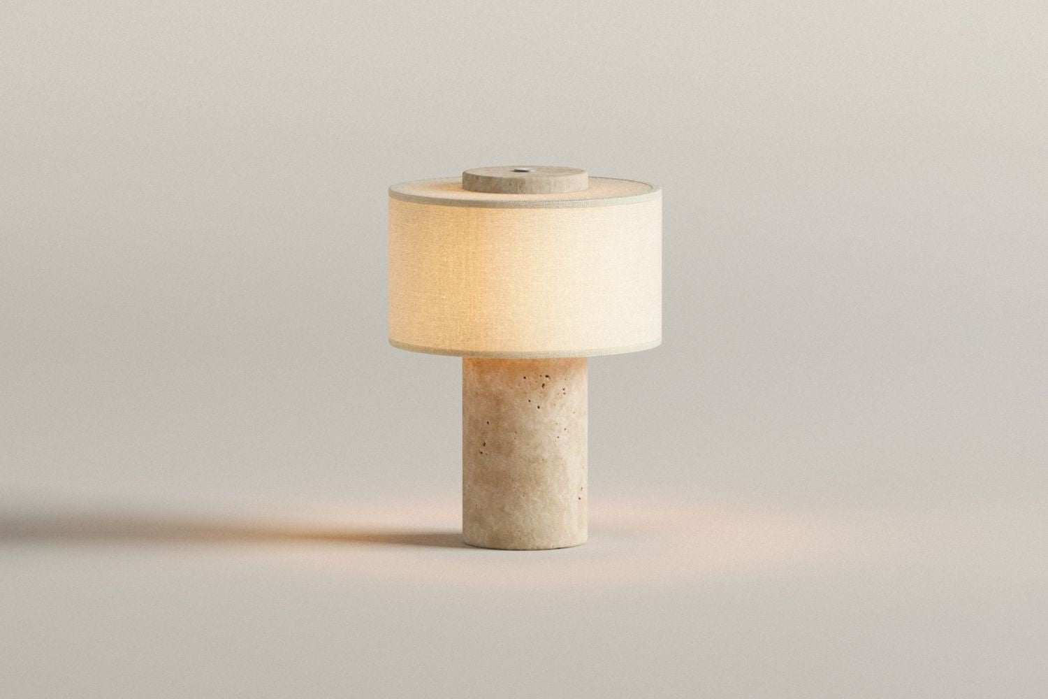 Natural marble base or a metallic finish paired with a cream linen shade.